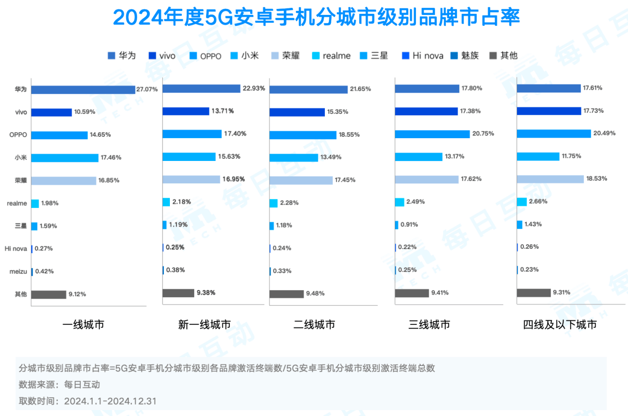 在安卓智能手机市场,华为在一线、新一线城市的市场份额稳固,同时在二线、三线及以下城市的市场份额也在不断扩大。小米则全线发力,各线城市市占率均有所提升。而魅族自去年一季度重新获得关注以来,也呈现出稳步增长的趋势,尤其在一线、新一线及二线城市,市占率显著提升。