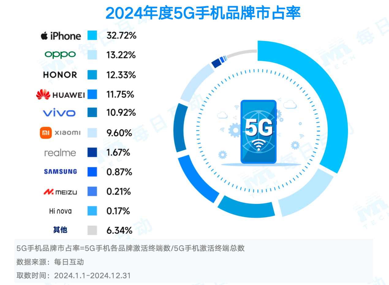 尽管面临众多国产手机的竞争,苹果凭借其降价策略,依然稳坐5G手机市场的头把交椅,市占率高达32.72%。然而,其他品牌并未坐以待毙,而是积极寻求突破,市场份额同比增长了129%,市场变局一触即发。国产四巨头华为、小米、OPPO、vivo的市场表现虽有所波动,但魅族凭借“all in AI”战略,异军突起,成为市场中的一股新力量。